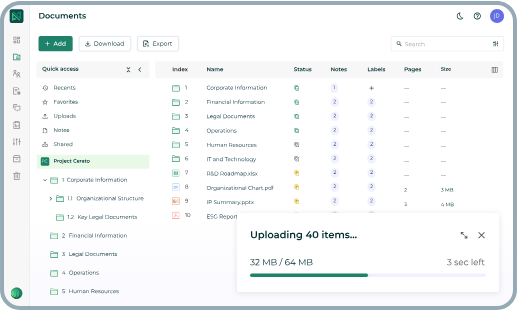 A well-built VDR ensures that sensitive personal or financial data is properly stored, tagged, and protected with the necessary access permissions. All this supports compliance with GDPR, SOC 2, and ISO 27001.