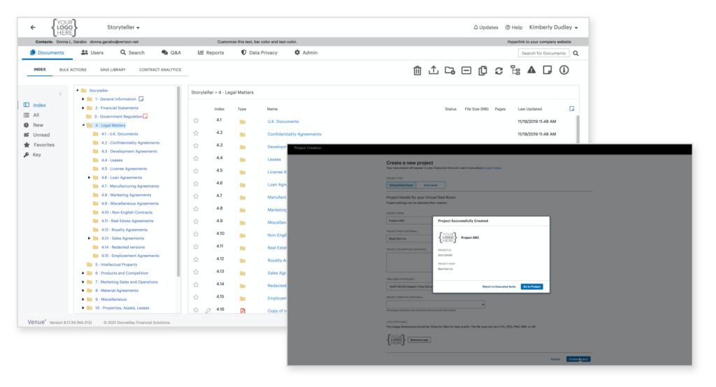Developed by financial disclosure experts, DFIN Venue is purpose-built for capital markets and regulated environments. It integrates well with deal prep workflows and offers built-in AI contract analysis, automated document tagging, and a strong focus on compliance. The platform supports advanced collaboration features for legal and finance teams, featuring reliable encryption for sensitive data and high-speed performance.